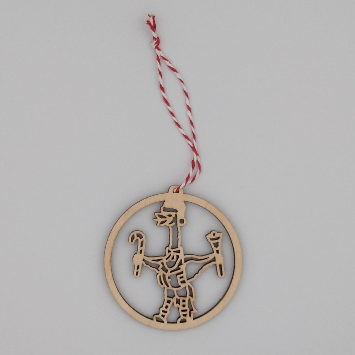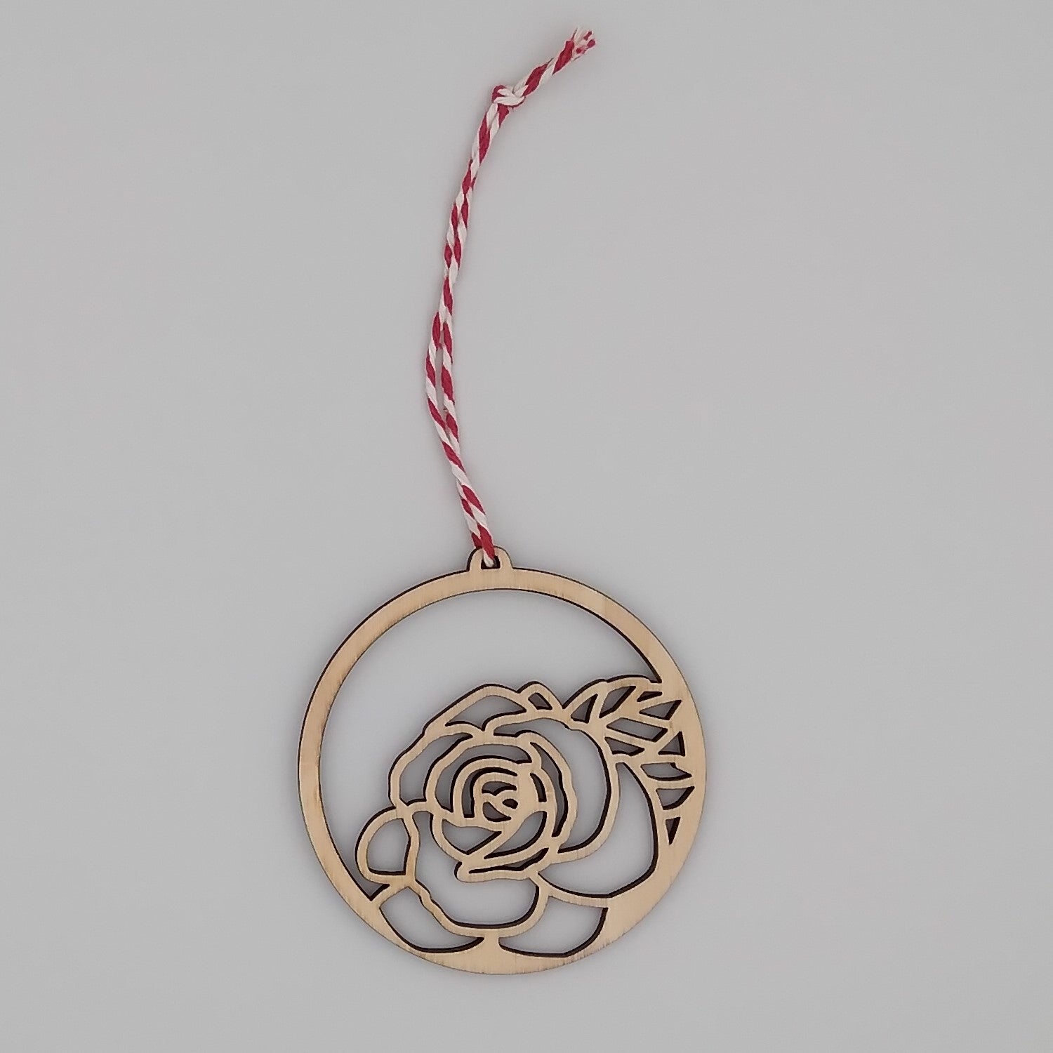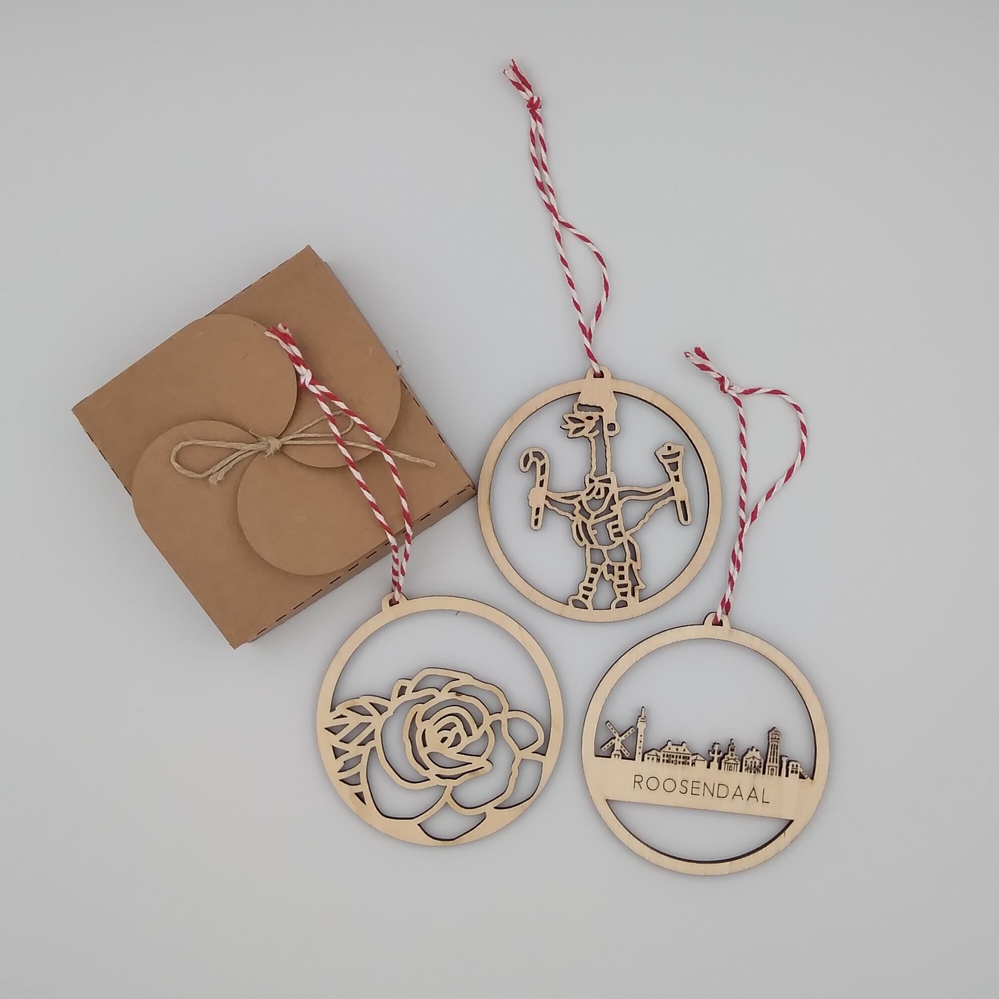 Set van drie houten kersthangers aan rood-wit koordje. Een roosje, de Tullepetaon en de skyline van Roosendaal. Verpakt in cadeaudoosje.