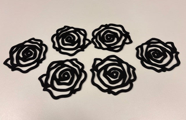 6 zwarte onderzetters in de vorm van een roos.